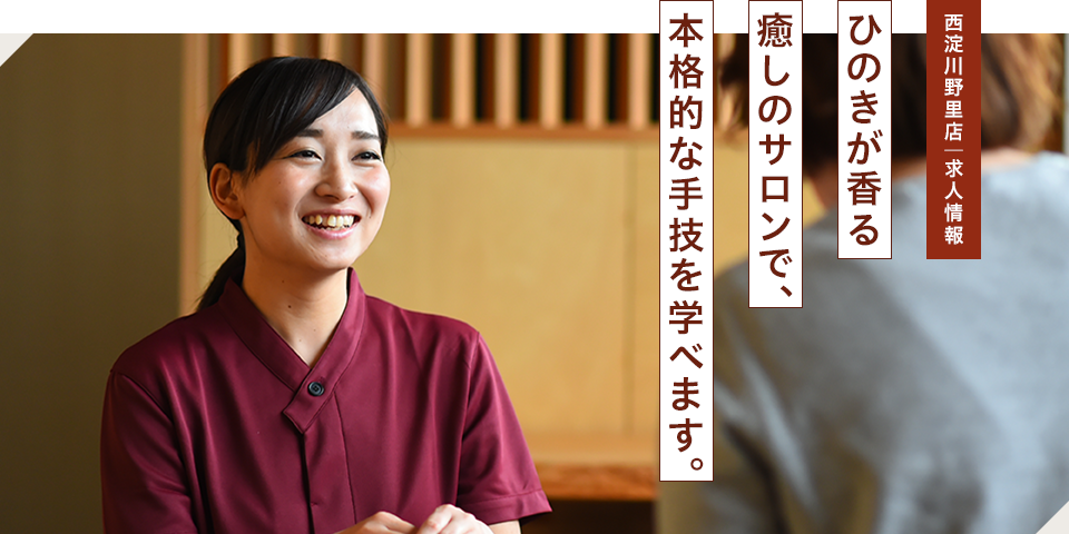 | 応募資格 | ・人を癒すことに興味のある方 ・リラクゼーション業界に興味のある方 ・整骨院発祥の技術で、手に職をつけたい方 ・充実した無料研修制度でスキルアップしたい方 ・土日祝のいずれかで勤務できる方 ・週3日以上勤務できる方(ダブルワークもOK!) |